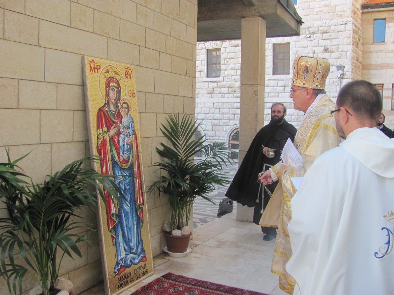 Иконата в базиликата на храма „Св.Благовещение” в Назарет е пренесена от София в края на м.г. от поклонническа група,включваща католици и православни,водена от Христо Пройков-апостолически екзарх и председател на Епископската конференция на Католическата църква в България. Изображението носи името „Св.Богородица-Врата небесна“  и е прототип на икона от Месемврия, любима на АнджелоДжудзепе Ронкали-апостолически делегат на Ватикана в България през периода 1925-1934. По време на едно от посещенията си в Месемврия, виждайки иконата на Св.Богородица в несебърската църква, той така се прехласва, че си поръчва репродукция от нея, която го придружава през целия му живот. Покрай иконата Ронкали се влюбва в Несебър до степен да поиска аудиенция при папа Пий ХІІ пред когото заявява желанието си за промяна на архиепископската си титла от Ареополски на Месемврийски. Изработката на иконата  е дело на художника Стоян Карагеоргиев.Изображението е мозайка с размери 200 х 70 см в класически византийски стил и технология. Самата икона на Богородица от Несебър, осъществена в тази мозайка, носи в себе си икуменичен момент. Тя е в източен стил,приет от християните в България като традиция,и същевременно-поставена в католическата базилика. Иконата от мозайка е осветенаи вече е редом до иконите на Франция и Етиопия, съвсем близо да входа на базиликата,от дясната страна на статуята на Богородица в двора на черквата. По този начин Несебър отново представя България-този път с икона на „Св.Богородица  -Врата небесна” с надпис: „Майко Божия,моли се за нас”.